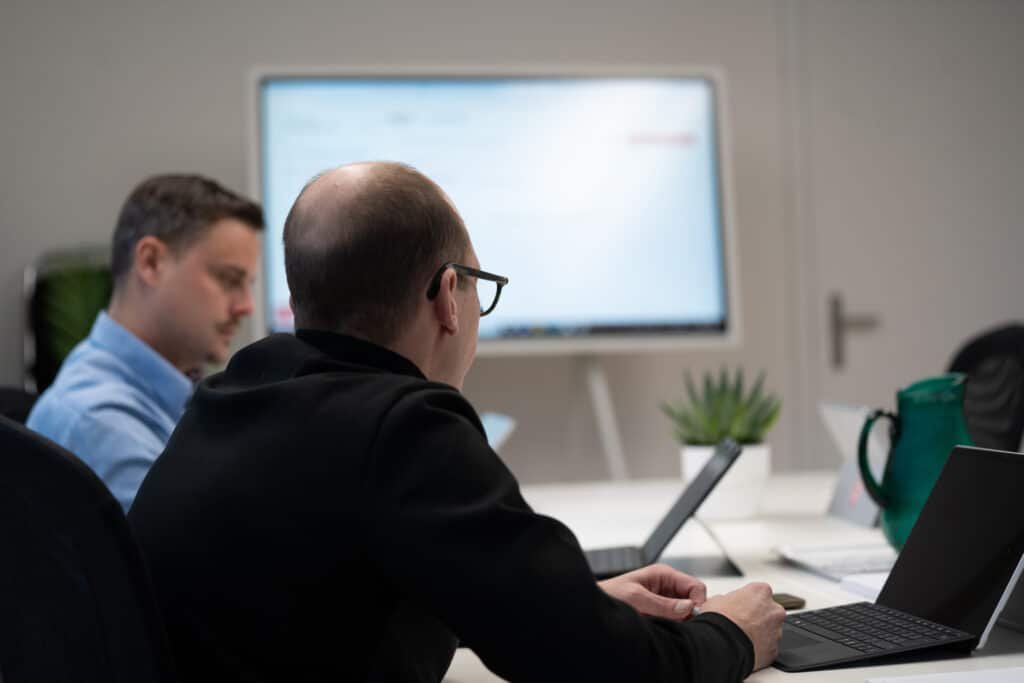 Drei Mitglieder des myls Teams arbeiten gemeinsam an einem Bildschirm